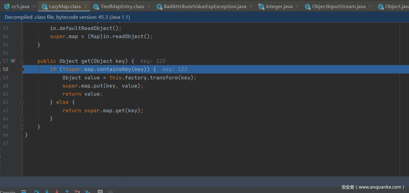 这里的this.map为LazyMap实例化对象,是在创建TiedMapEntry对象的时候传参进去的。再跟进一下get方法就和前面调试CC1链的步骤一样了。
