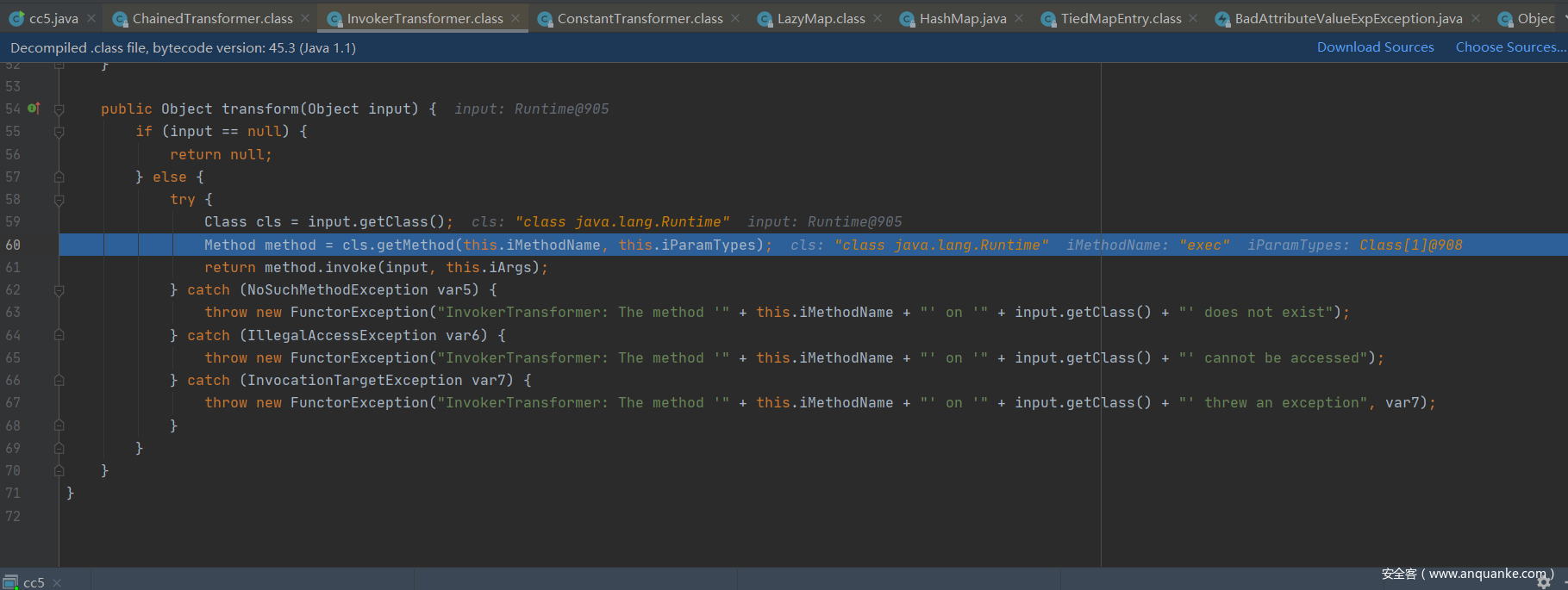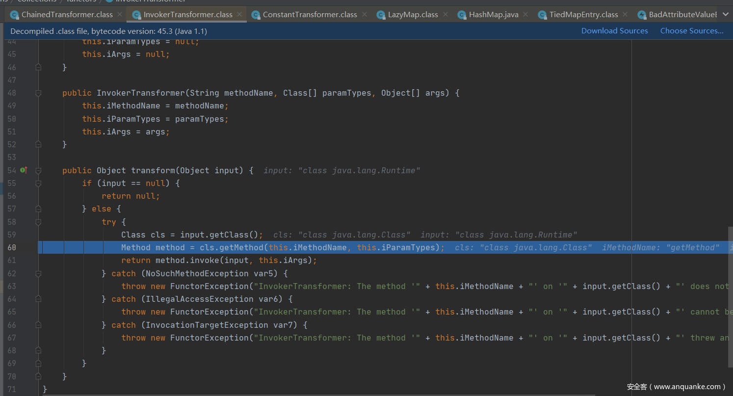前面的new了一个HashMap传入到LazyMap里面,同时也传入了ChainedTransformer实例化对象,当调用get方法的时候,就会调用到ChainedTransformer的transformf方法,这个没啥好说的,老面孔了。前面也分析过好几回了。主要的是下面的这一段代码。