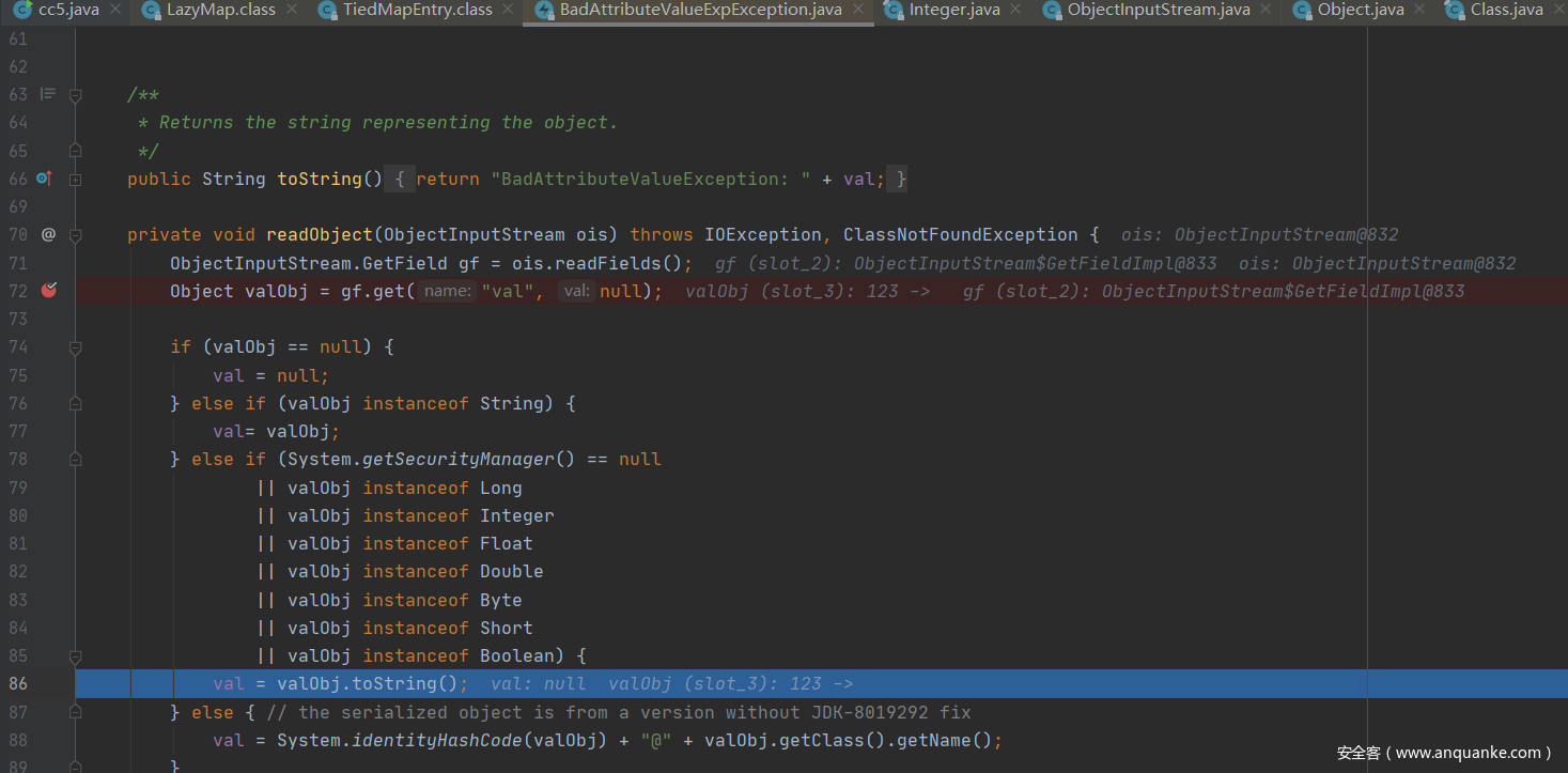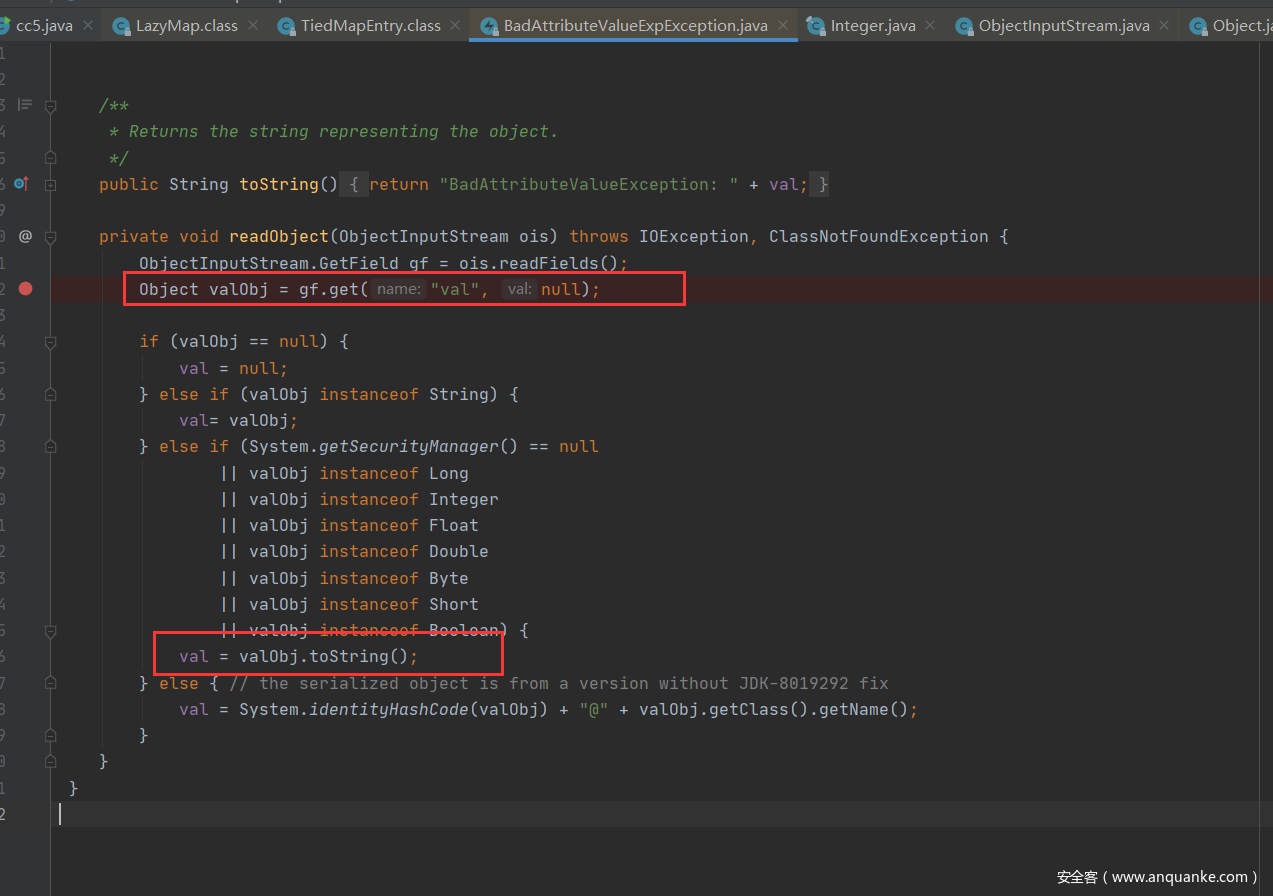 在readObject复写点打个断点,也就是BadAttributeValueExpException的readObject方法。