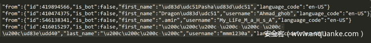 - getUpdates方法:使用这个方法公开了发送给bot的所有命令的历史记录,包括命令来自的用户名。从仍在响应并具有更新历史记录的bots(根据Telegram的政策,接收更新只保留24小时),我们能够找到来自四个Telegram帐户的bot命令,如下所示。