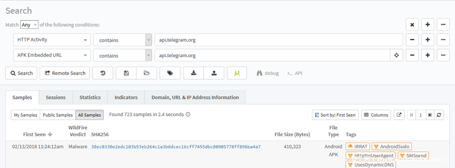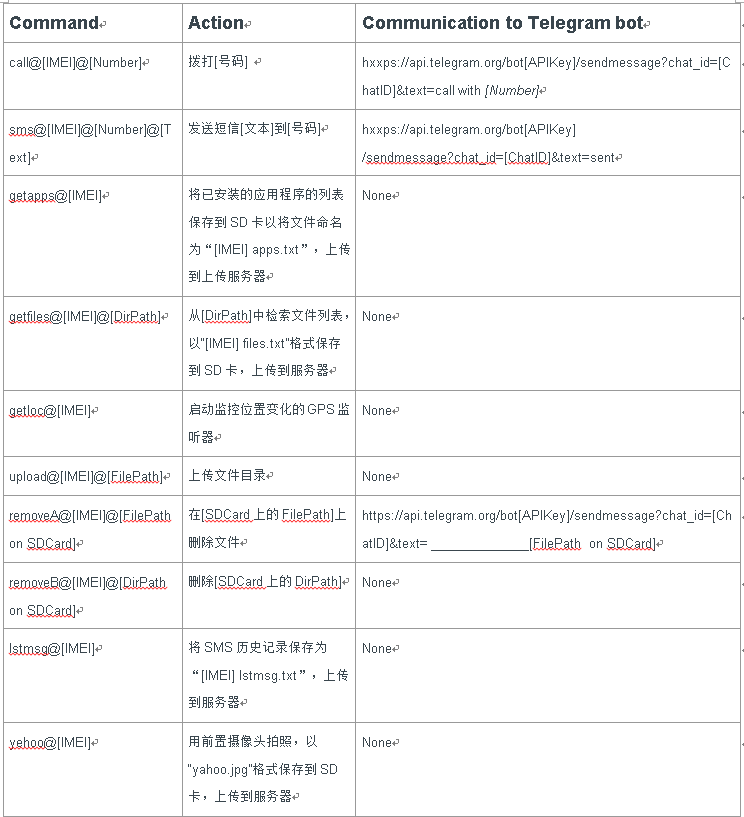 TeleRAT是IRRAT的升级版,它避免了IRRAT基于向已知服务器传输数据的网络检测方式,因为所有通信(包括上传)都是通过Telegram bot API完成的。但它仍然留下了一些基于使用Telegram’s bot API的一些痕迹,例如硬编码在APK文件中的API密钥。