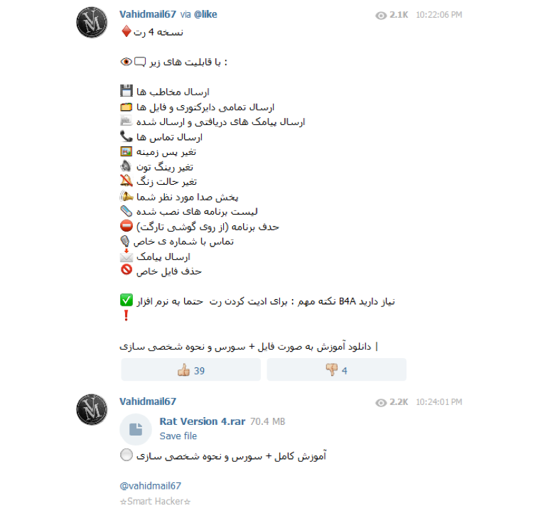 进一步查找“vahidmail67”的Telegram channel,我们发现了应用程序和构建器的广告,这些应用程序和构建器涵盖的范围很广——从热门应用程序到Instagram,再到勒索软件,甚至是一个未命名的RAT病毒的源代码(完整的视频教程,如下所示)。
