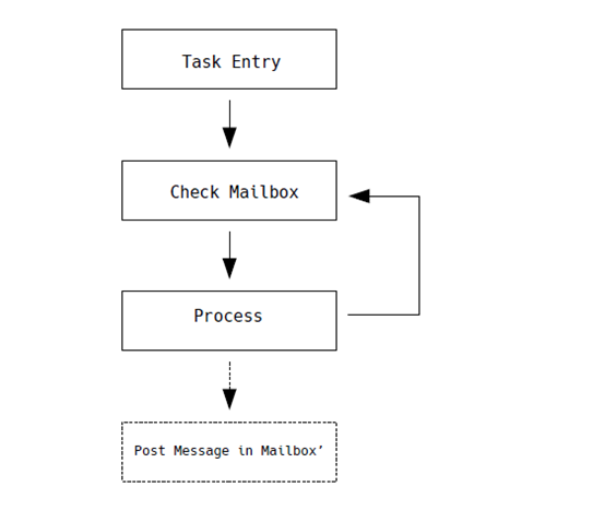 如下图所示,每个Task的流程大致如此,检查Mailbox中是否有自己的消息,处理消息,必要时还需要向其他Task发送消息,很多个Task协同完成整个基带协议栈的功能。
