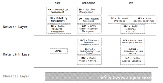 Amat决定分析更为复杂的GPRS,开始阅读GPRS标准并分析GPRS的会话管理相关信令。下图是GPRS信令协议分层。
