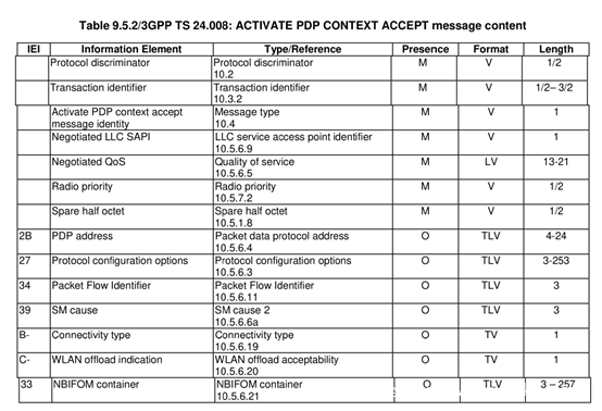 通过对标准的阅读,发现‘ACTIVATE PDP CONTEXT ACCEPT‘这条信令比较复杂,看起来很适合深入分析,下图是该信令各区段的详细定义