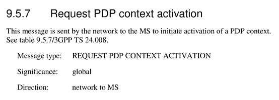阅读3GPP标准更多的内容之后,发现通过给手机发送‘REQUEST PDP CONTEXT ACTIVATION ‘信令可以之后,可以强制手机发送’ ACTIVATE PDP CONTEXT REQUEST ‘。