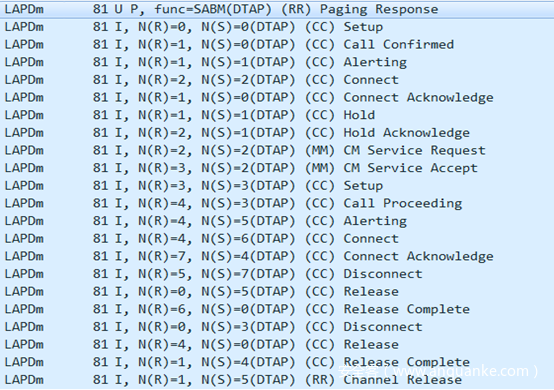 如果想熟悉一下call control信令,也可以搭个osmocomBB,将mobile功能跑起来,用wireshark抓一下信令,具体请参阅《无线电安全攻防大揭秘》,下图是我抓的一个电话呼叫信令。