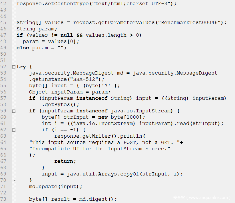 示例源于Benchmark (https://www.owasp.org/index.php/Benchmark),源文件名:BenchmarkTest00046.java。