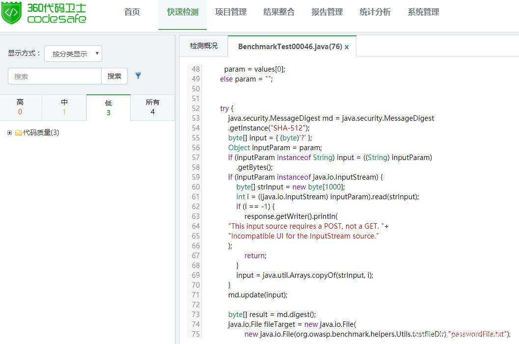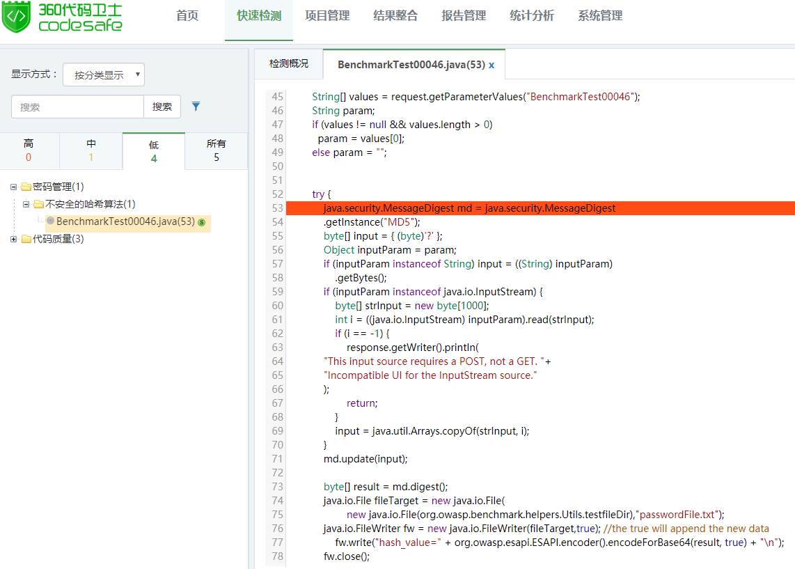 使用360代码卫士对上述示例代码进行检测,可以检出“不安全的哈希算法”缺陷,显示等级为低。在代码行第53行报出缺陷,如图1所示: