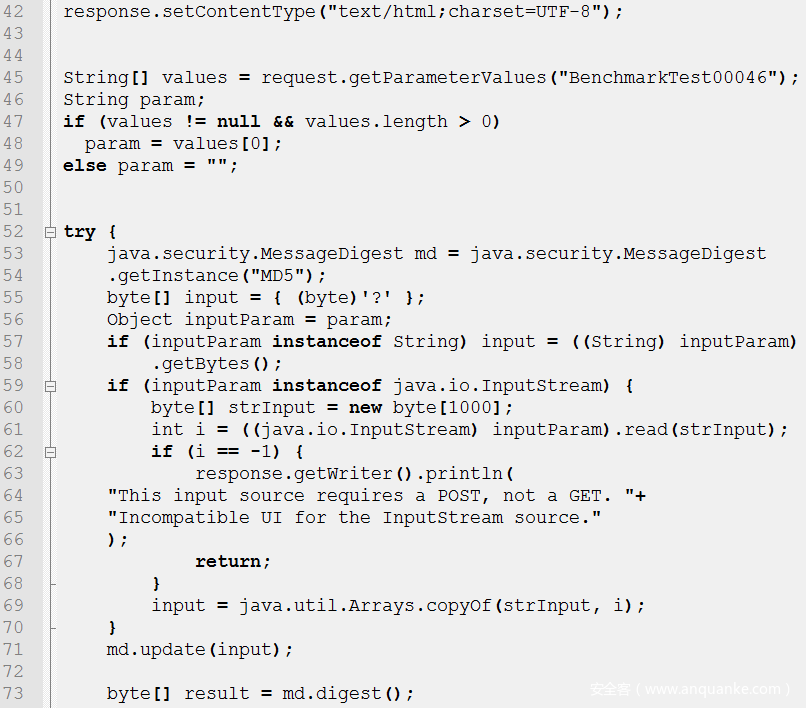 上述示例代码操作是将请求参数转换为哈希值的操作,在第45行获取请求参数 BenchmarkTest00046。在第53行获取一个MD5转换器,在第55行~70行将获取的请求参数值转换为字节数组,第71行将字节数组作为参数传入MD5转换器,第73行获得转换后的字节数组。由于MD5是已经公认已破解的哈希算法,使用该哈希算法来处理数据会损害数据的机密性,导致信息泄露。