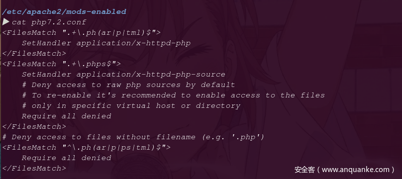 通过FilesMath匹配文件后缀,其默认配置是当匹配到phar、php、phtml时,都将其作为php来执行,其中SetHandler就是设置解析方式