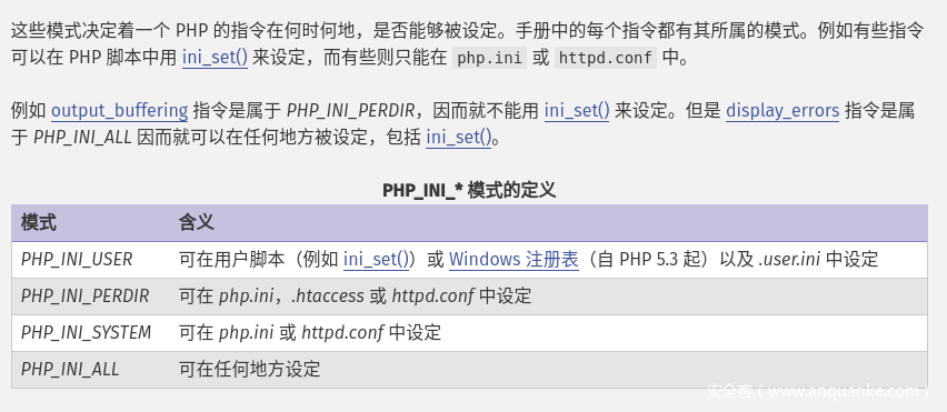 从上图可知,.htaccess可以使两种配置模式生效:PHP_INI_PREDIR和PHP_INI_ALL