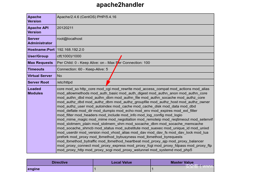 (3)这种方法条件为apache加载了cgi_module,这里截的de1ctf checkin这道题目的phpinfo: