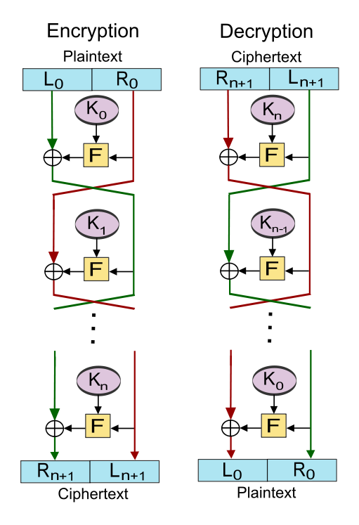TEA(Tiny Encryption Algorithm)微型加密算法是一种易于描述的基于块的加密手法。通常来说,TEA加密算法会作用在两个32bit的无符号整数上(又或者可以理解成一个64bit的整数),并且会使用一个128bit的数字作为密钥。其拥有一个叫做Feistel 结构的密码学结构。这种密码学结构通俗的来讲就是会将加密的plaintext分成L、R两部分,并且满足 L_{i+1} = R_i, R_{i+1} = F(K_i,R_i) \oplus L_i 这种交换式的加密方式的一种结构。