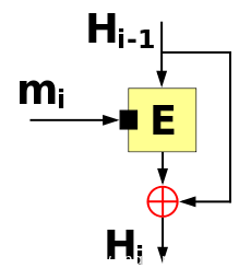 单向要锁函数通常是由块加密算法变形而来的,一种常见的就是Davies–Meyer算法。该算法将消息的每个块(mi)作为加密算法的密钥。 它将上一次加密生成的哈希值(Hi-1)作为要加密的明文输入。 之后,将输出密文与上一个哈希值(Hi-1)进行异或(⊕),以产生下一个哈希值(Hi)。 在第一轮中,如果没有以前的哈希值,它将使用一个恒定的预先指定的初始值(H0),算法可以写成H_i = E_{m_i}(H_{i-1}) \oplus H_{i-1}