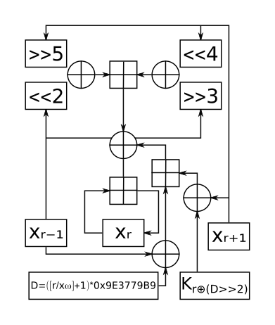输入一定要是一个64bit的数字,或者可以写作一个拥有两个元素的32bit的数组。,并且需要一个两倍长度的key(int[4])。整个加密流程如下: