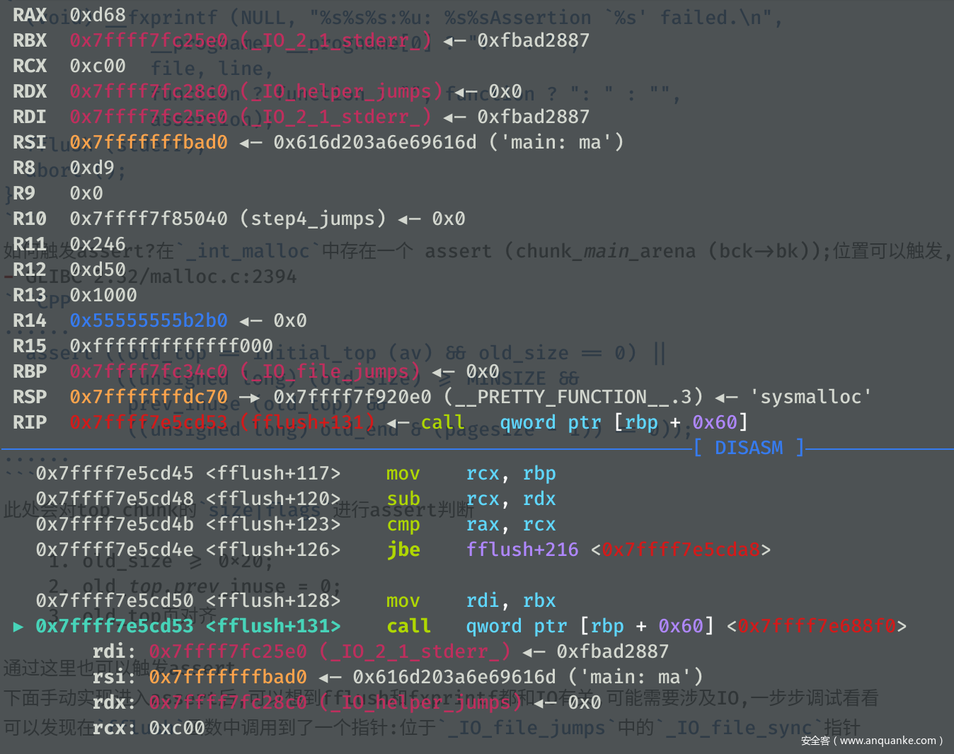 glibc中ptmalloc部分,从以前到现在都存在一个assret断言的问题,此处存在一个fflush(stderr)的函数调用,其中会调用_IO_file_jumps中的sync指针static void __malloc_assert (const char *assertion, const char *file, unsigned int line, const char *function) { (void) __fxprintf (NULL, "%s%s%s:%u: %s%sAssertion `%s' failed.\n", __progname, __progname[0] ? ": " : "", file, line, function ? function : "", function ? ": " : "", assertion); fflush (stderr); abort (); }如何触发assert?在