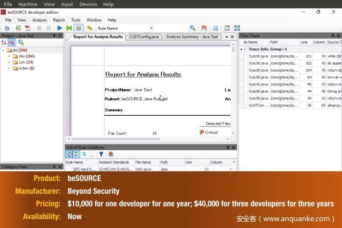 主要特性:beSOURCE是一个静态应用安全测试工具,可在程序员找到问题后告诉程序员问题的相关信息。它安装在一个无需编译器的检测引擎上,支持多种编程语言。该工具的第一版是为程序员打造的独立工具;未来的版本将支持企业级和云部署。