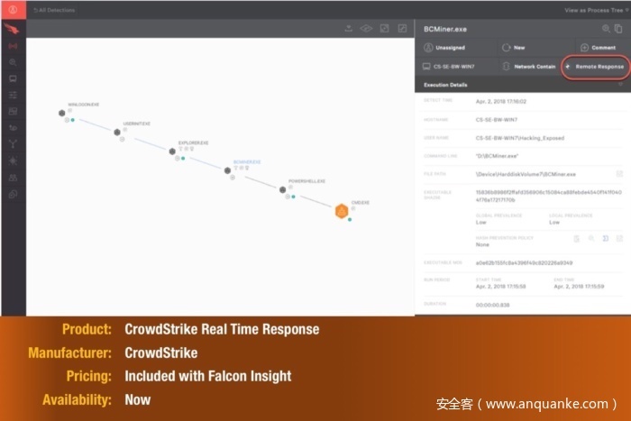 主要特性:新增加到Falcon Insight中的一项特性,实时响应旨在帮助客户远程控制受损系统,以便他们调查和消除威胁。