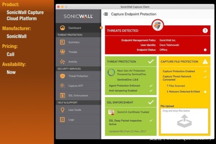 主要特性:SonicWall Capture Client现在有了高级端点安全和恢复功能。其他捕获云平台的要素也得到了升级:“捕获安全中心”现在为特定客户提供可视化操作和设备管理,而多亏了深存储检测功能,Capture ATP客户可从基于内存的攻击保护中受益。