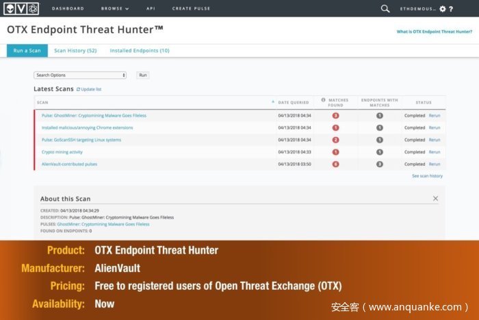 主要特性:任何注册了Open Threat Exchange的用户都可以免费使用这款威胁扫描服务。其参与者贡献了1900百万威胁指标,可以让安全人员捕获关键服务器上的威胁,而无需依赖其他产品。AlienVault客户端可在Windows,Linux主机和端点设备上运行。