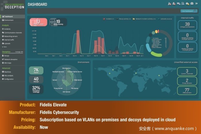 主要特性:Fidelis Elevate已经升级。其欺骗模式限制已经扩展到云中,使用有源诱饵模拟关键目标,诱骗攻击者远离真正目标。在网络上,其对新入侵指标的反向检测效力已经通过一个沙箱分析增强。端点模块现在可为分析师呈现时间线上的事件细节,由此可提供运行语境。