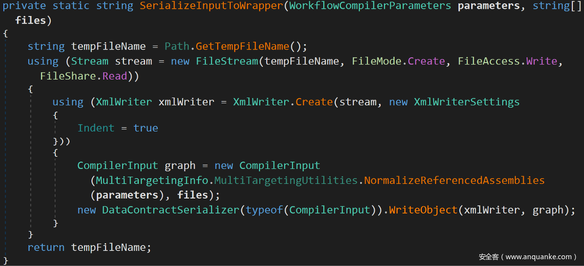 因此现在的问题是,我们如何才能生成序列化的CompilerInput对象?幸运的是,我发现了一个内部方法Microsoft.Workflow.Compiler.CompilerWrapper.SerializeInputToWrapper,可以帮我们完成这个任务:
