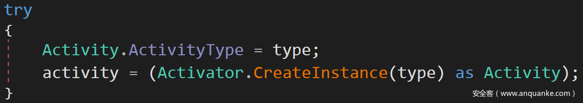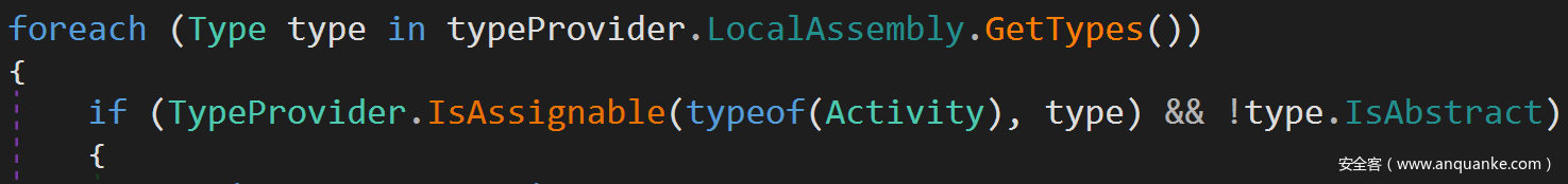 单纯加载assembly并不能让程序帮我们执行任意代码,有些时候为了加载assembly我们必须先满足一些条件。幸运的是,System.Workflow.ComponentModel.Compiler. XomlCompilerHelper.InternalCompileFromDomBatch方法会遍历已加载assembly中的每个类型,实例化继承自System.Workflow.ComponentModel.Activity类的每个实例,如下图所示: