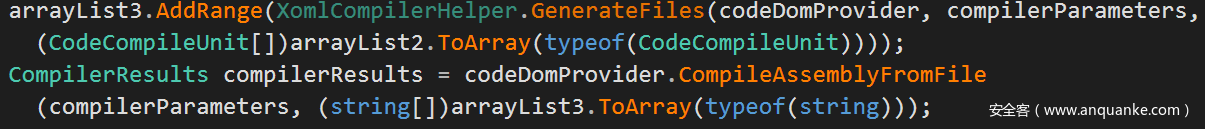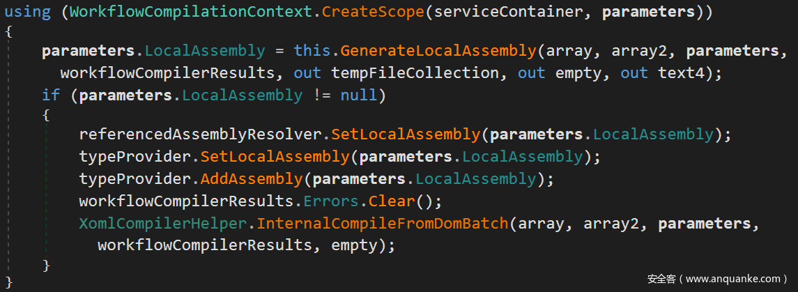 因此第一步就是判断谁调用了Assembly.Load(byte[])。这个任务并不难,我们可以使用dnSpy工具,在System.Workflow.ComponentModel.Compiler.WorkflowCompilerInternal.Compile方法中找到如下片段: