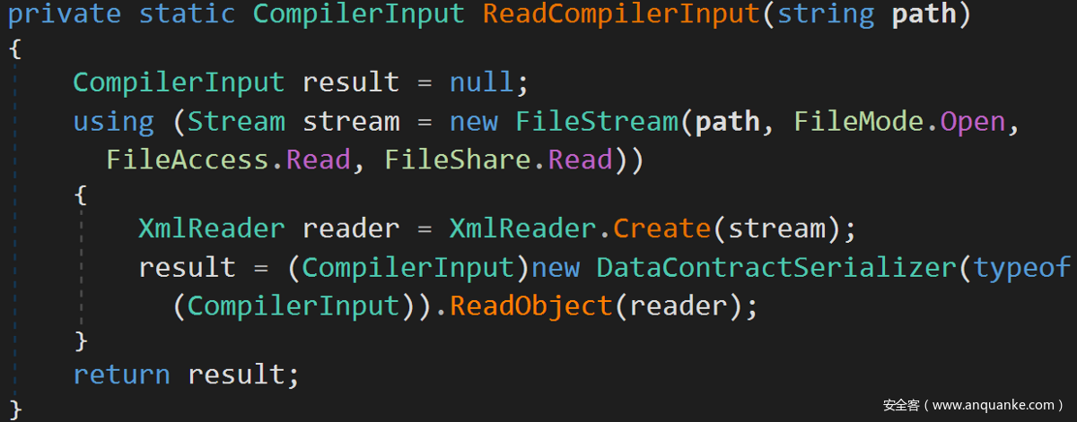 当Microsoft.Workflow.Compiler.exe启动时,会将第一个参数传递给ReadCompilerInput方法,后者收到文件路径后,会将其反序列化为CompilerInput对象: