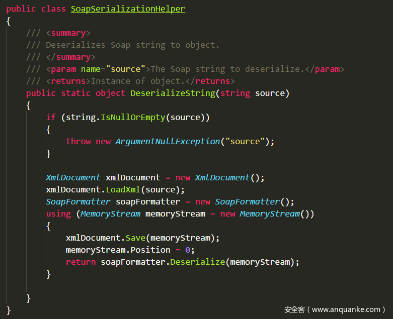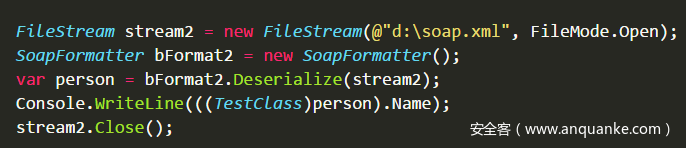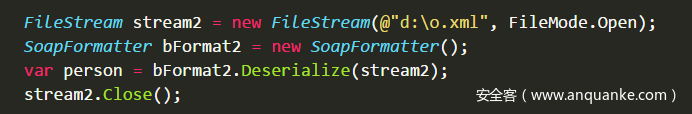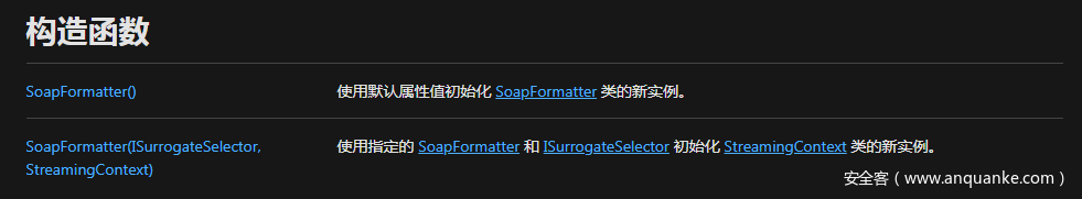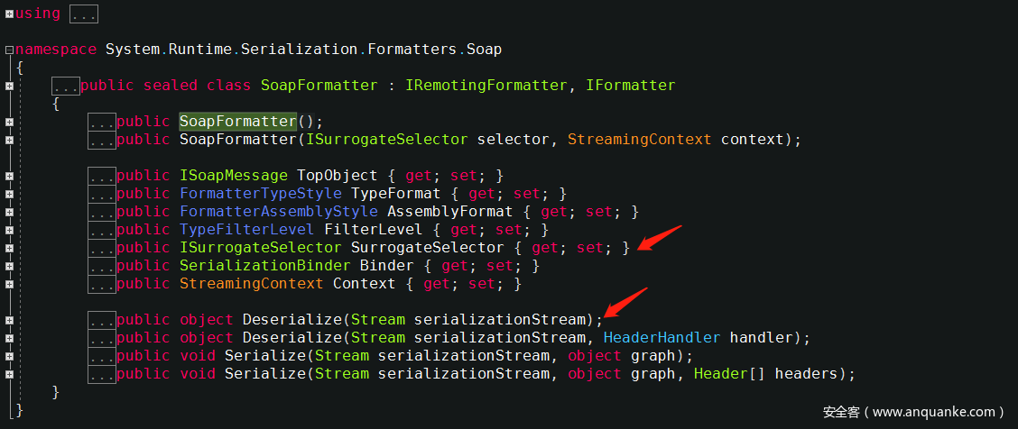 SoapFormatter类反序列化过程是将SOAP消息流转换为对象,通过创建一个新对象的方式调用Deserialize多个重载方法实现的,查看定义得知实现了IRemotingFormatter、IFormatter接口,