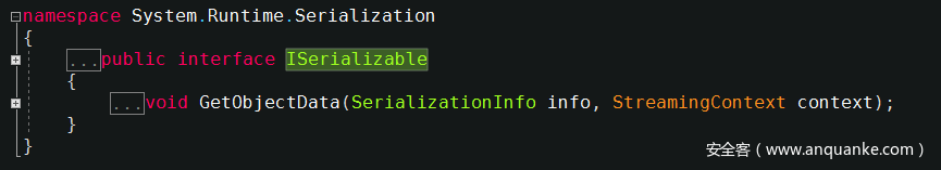 再回到GetObjectData方法体内,另外为了对序列化数据进行完全控制,就需要实现Serialization.ISeralizable接口,定义如下: