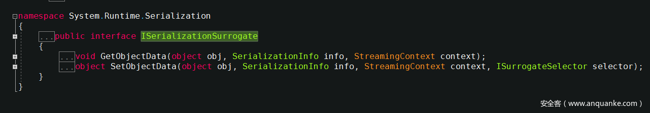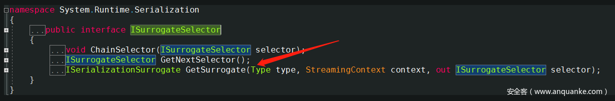 在SoapFormatter类的定义中除了构造函数外,还有一个SurrogateSelector属性, SurrogateSelector便是代理选择器,序列化代理的好处在于一旦格式化器要对现有类型的实例进行反序列化,就调用由代理对象自定义的方法。查看得知实现了ISurrogateSelector接口,定义如下