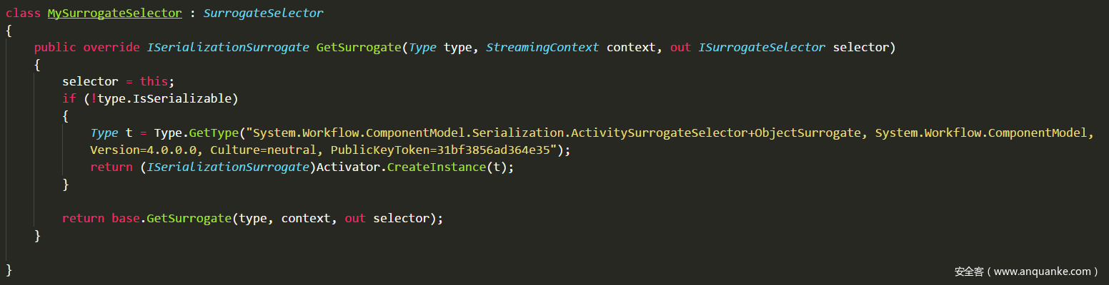 代码中判断类型解析器IsSerializable属性是否可用,如果可用直接基类返回,如果不可用就获取派生类 System.Workflow.ComponentModel.Serialization.ActivitySurrogateSelector的类型,然后交给Activator创建实例