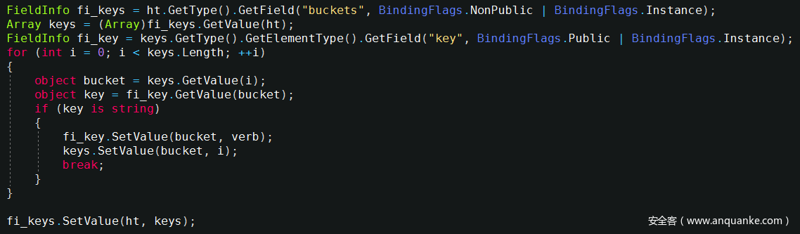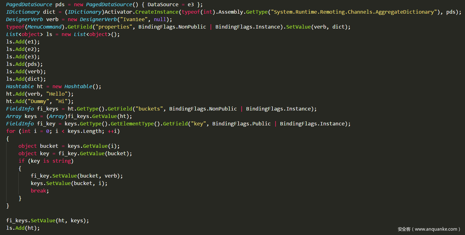 除此之外System.Runtime.Remoting.Channels.AggregateDictionary返回的类型支持IDictionary,然后实例化对象DesignerVerb并随意赋值,此类主要为了配合填充MenuCommand类properties属性的值,最后为哈希表中的符合条件的buckets赋值。