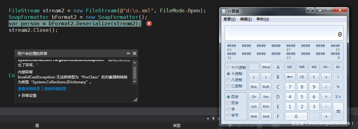 因为指定了RemotingFormat属性为Binary,所以引入了BinaryFormatter格式化器并指定属性SurrogateSelector代理器为自定义的MySurrogateSelector类。序列化后得到SOAP-XML,再利用SoapFormatter对象的Deserialize方法解析读取文件内容的流数据,成功弹出计算器