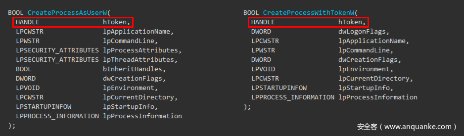 如上图所示,这两个函数与标准的CreateProcess()函数并没有太多差别。然而,这两个函数都需要指向令牌(token)的一个句柄。根据官方文档,hToken必须为“指向用户主令牌(primary token)的句柄”。此外,文档中还有如下一段话: