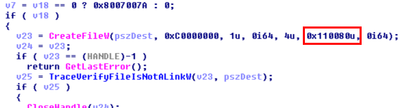 十六进制的值0x110080实际上为SECURITY_SQOS_PRESENT | SECURITY_IDENTIFICATION | FILE_ATTRIBUTE_NORMAL。