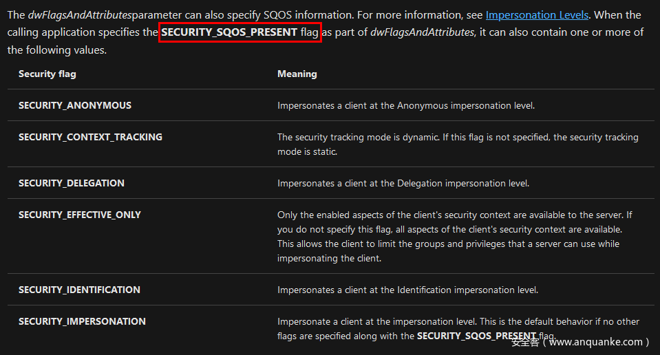 参考官方文档,我们发现可以在CreateFile()函数中指定很多属性。如果我们设置了SECURITY_SQOS_PRESENT标志,就可以控制我们令牌的模拟级别。