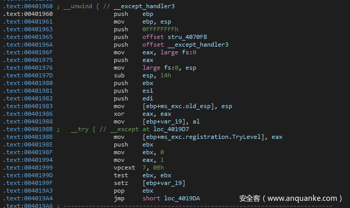 这里直接修改了esp的值,开辟了一个栈空间,然后call sub_401A00,这里可以看到,call sub_401A00之后,会通过test al,al 这个指令判断al的值是否为0,如果al寄存器不等于0,则通过jnz跳转到loc_401BB2处继续执行。