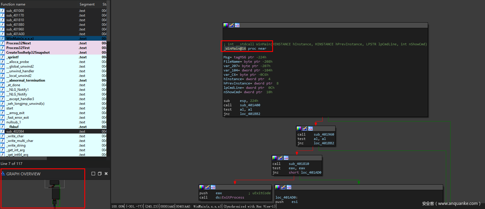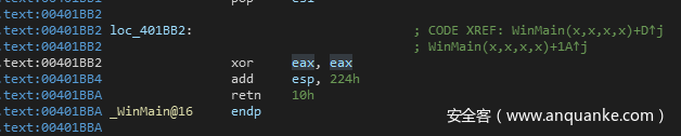 可以看到,当程序跳转到loc_401BB2执行后,WinMain执行retn指令,程序就退出了。