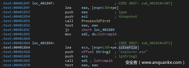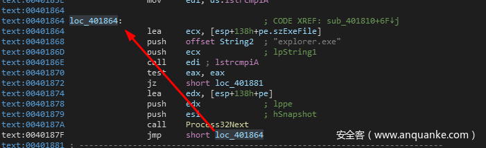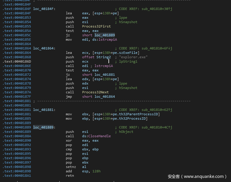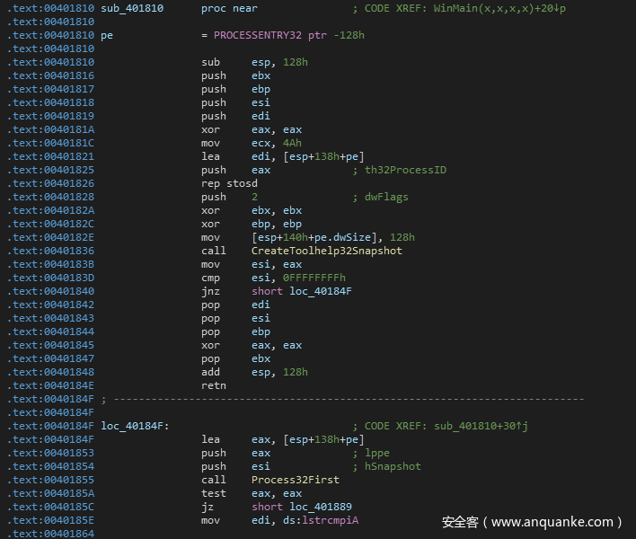 loc_40184F这里,首先会调用Process32First来获取当前进程列表中第一个进程的句柄。