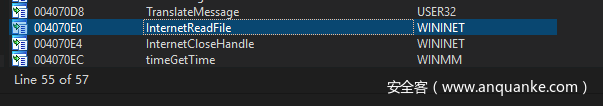 程序一共有57个导入表,大多数都是正常的,只是在最后看到了如下的导入表信息