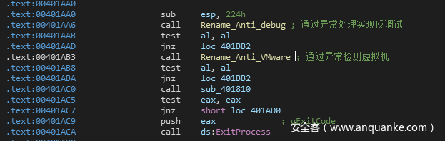 搜索引擎告诉我们,该语句可以用于反调试。通过查看搜索出来的文档,我们也可以基本确定这里是用于反调试,于是我们可以修改sub_401A00并对其进行标注。