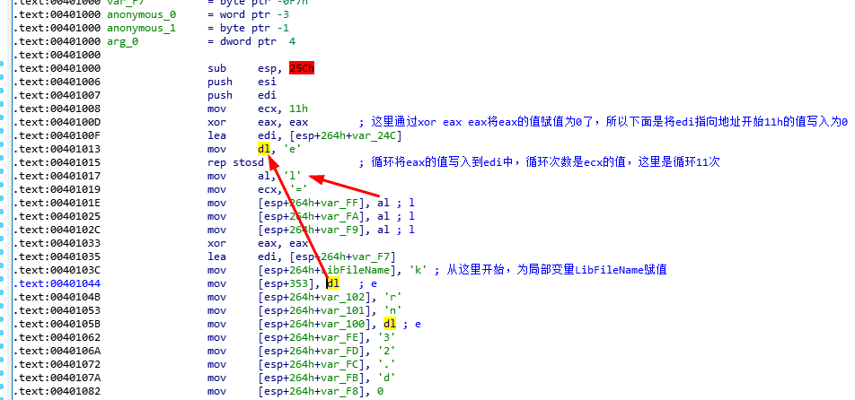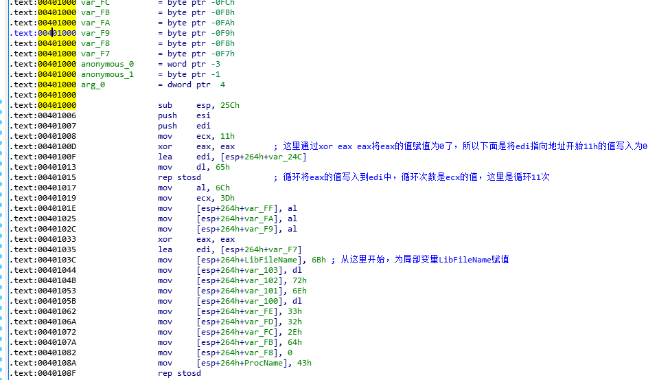 00401000函数进来之后,通过lea edi, [esp+264h+var_24C]给EDi赋值,然后通过rep stosd将edi的前面11h大小的空间写为0。